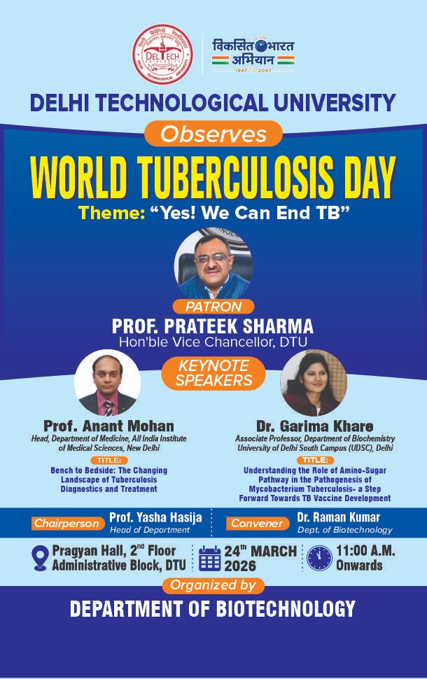 Department of Biotechnology, Delhi Technological University is organising Faculty Development Programme (FDP) on “Healthcare and MedTech: Innovations, Challenges and Future Directions,” to be held online from December 9th to December 14th, 2024. This event is proudly sponsored by the AICTE Training & Learning Academy (ATAL)